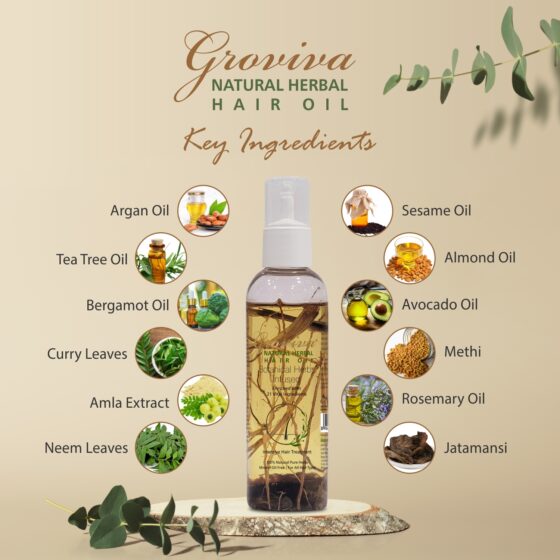 Groviva Natural Herbal Hair Oil has quick absorption over the scalp and provides an intensive hair & scalp treatment that not only controls hair-fall effectively from the very first application, but also takes care of all other issues like hair damage, thinning, dandruff, itchiness, premature greying, dry & frizzy hair, and split ends effectively. Groviva Natural Herbal Hair Oil also helps in controlling sebum production in the hair follicles and promotes hair growth. Groviva Natural Herbal Hair Oil is more than just an oil; it is a complete hair solution.